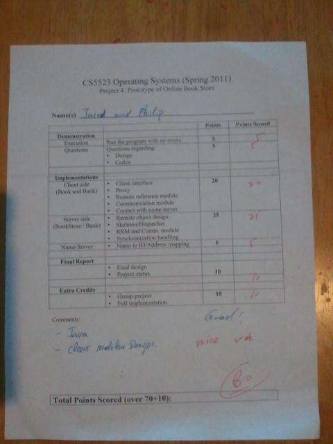 This was actually in the previous "3 years" (Spring of 2011) but I was very proud of my implementation. I worked together with another student to develop a remote object server for our Graduate OS class. The project was to create a mock bank application with remotely accessible account information. This was a highly modular design which used the same class to create servers for 1) the DNS server (ran all the time), 2) the bank account server (ran all the time), and 3) intermediate servers which made connections between a user and the bank account server.