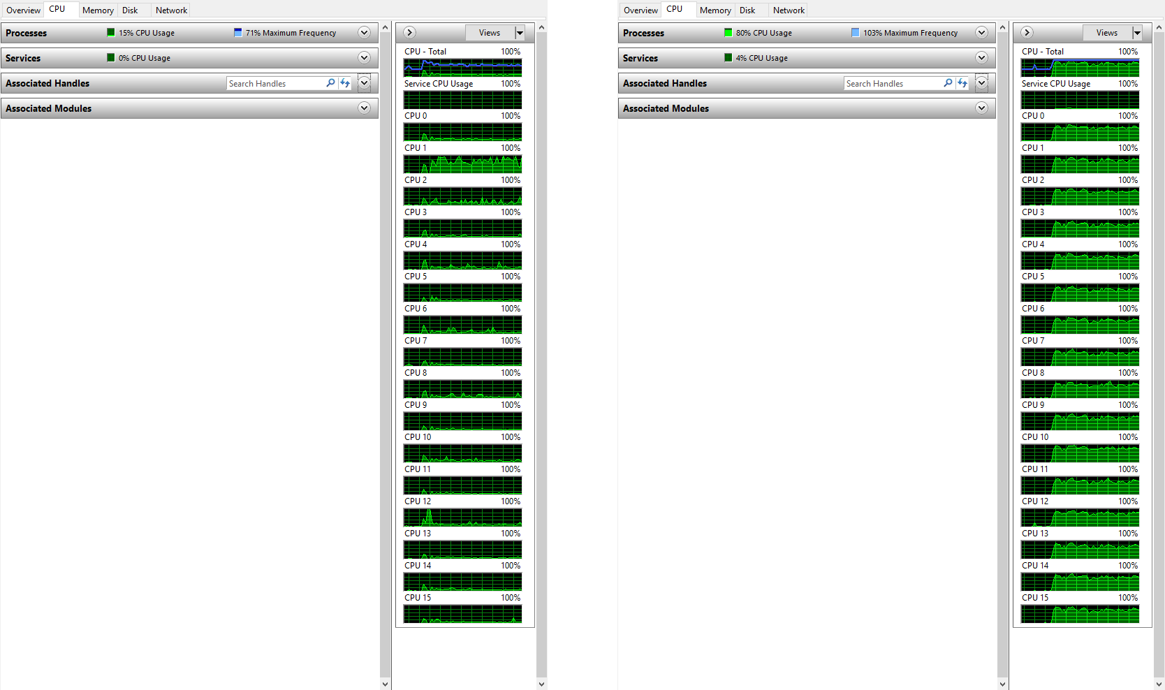 Here is a screenshot comparison of the resource monitor in Windows 10 as each started. I'll leave it up to the reader to decide which one is the parallel vs. serial version.